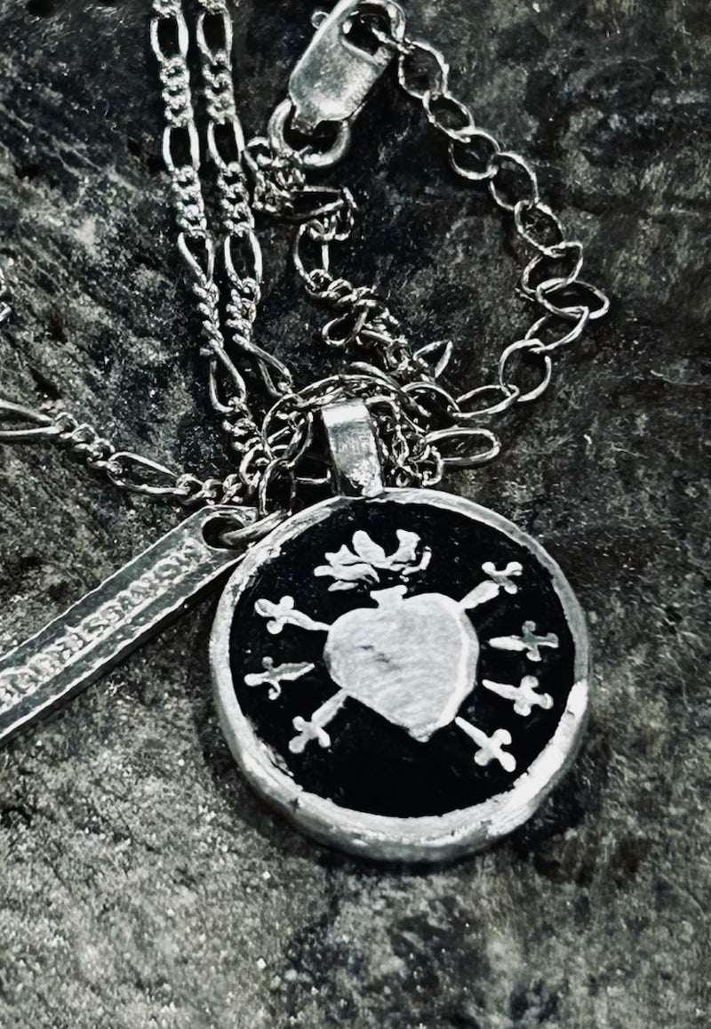 Beautiful handcrafted medallion completed with etched heart and seven sorrows design.