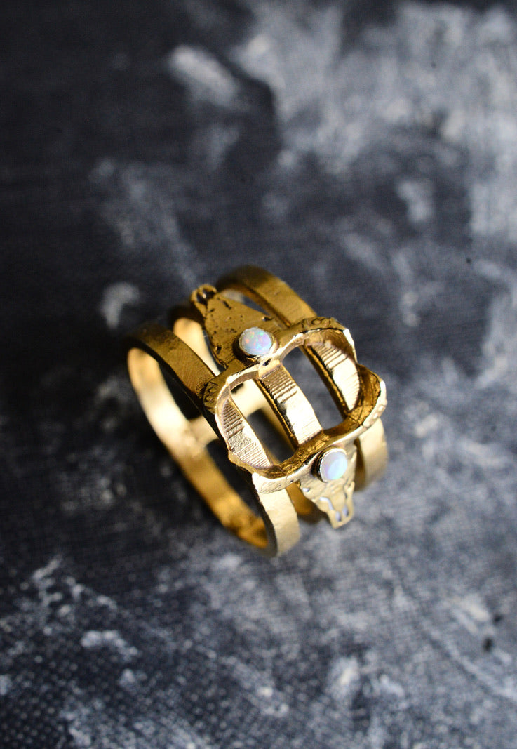 Handcrafted and cast triple band ring finished with bull duo completed with genuine stones.